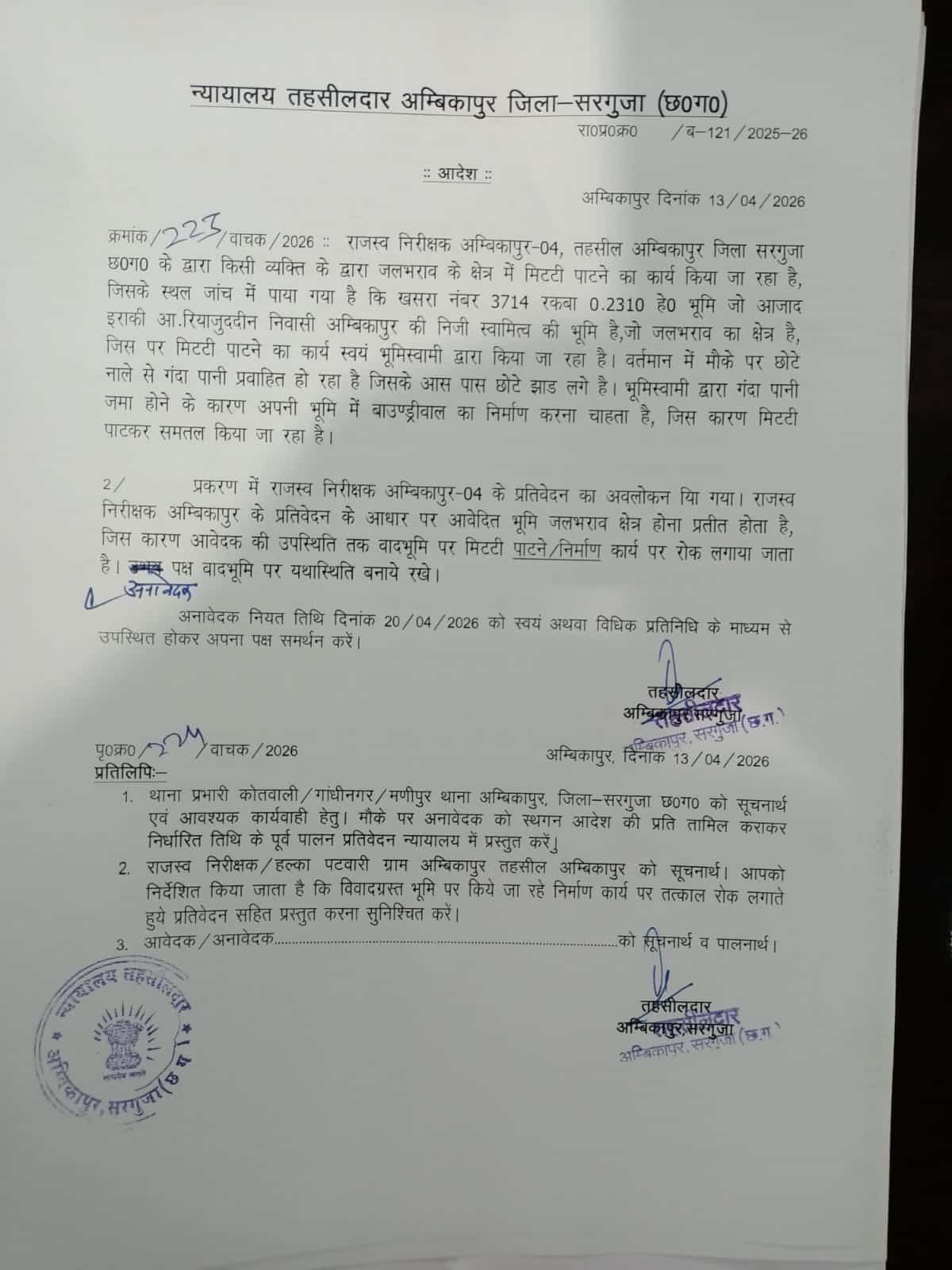 विवाद बढ़ने के बाद प्रशासन एक्शन मोड में आ गया है। अंबिकापुर एसडीएम फागेश सिन्हा के निर्देश पर तहसीलदार ने संबंधित जमीन को निजी स्वामित्व का बताते हुए भू-स्वामी आजाद इराकी को दस्तावेजों सहित कार्यालय में तलब किया है। तहसीलदार ने स्पष्ट किया है कि जब तक जमीन के दस्तावेजों की पूरी तरह से जांच नहीं हो जाती, तब तक वहां किसी भी प्रकार का निर्माण या भराव कार्य नहीं किया जा सकेगा।