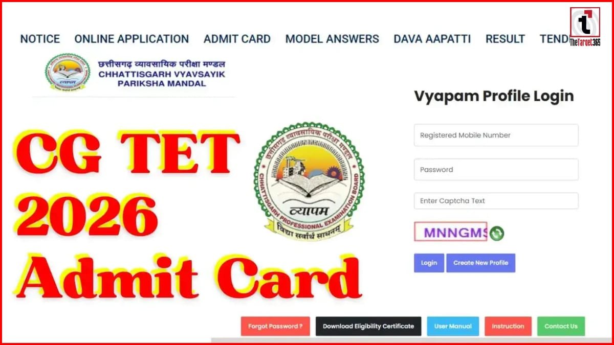छत्तीसगढ़ व्यावसायिक परीक्षा मंडल (CG VYAPAM) ने बहुप्रतीक्षित छत्तीसगढ़ शिक्षक पात्रता परीक्षा (CG TET) 2026 के लिए हॉल टिकट आधिकारिक तौर पर जारी कर दिए हैं। वे सभी उम्मीदवार जिन्होंने इस परीक्षा के लिए सफलतापूर्वक पंजीकरण कराया है, वे अब विभाग की आधिकारिक वेबसाइट vyapamcg.cgstate.gov.in पर जाकर अपना एडमिट कार्ड चेक और डाउनलोड कर सकते हैं। यह परीक्षा राज्य के स्कूलों में प्राथमिक और उच्च प्राथमिक स्तर पर शिक्षकों की भर्ती के लिए पात्रता निर्धारित करने हेतु एक अनिवार्य कदम है।
