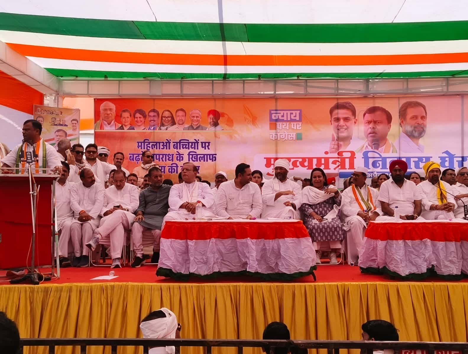 इस अवसर पर सभा को संबोधित करते हुये प्रदेश कांग्रेस अध्यक्ष दीपक बैज ने कहा कि यह लड़ाई छत्तीसगढ़ के हित के लिये है। यह लड़ाई सरकार के खिलाफ, भाजपा के खिलाफ, छत्तीसगढ़ की जनता की हक की लड़ाई है। छत्तीसगढ़ में माता, बहनों पर अत्याचार हो रहा है। सरकार जागने को तैयार नही, वह सत्ता के नशे में मस्त है। छत्तीसगढ़ अपराधगढ़ बन गया है। दुर्ग में 6 साल की बच्ची के साथ बलात्कार कर हत्या कर दी जाती है। वही लोरमी में 7 साल की बच्ची गायब है। कल हमने 10 किमी की पदयात्रा निकालकर ज्ञापन सौंपा। मरवाही में 9वी की छात्रा से बलात्कार हो गया है। बेमेतरा में 12 साल की बच्ची के साथ बलात्कार हो जाता है और हत्या कर दी जाती है। इस प्रदेश में माता, बहनों को बचाना है और भाजपा के सरकार को जगाना है। बैच ने कहा कि इससे पहले विधानसभा घेराव, ब्लाक, जिला स्तर पर धरना प्रदर्शन भी किया गया था पर सरकार को कोई असर नही पड़ा। छत्तीसगढ़ में बलात्कार, लूट, डकैती, अपरहरण के आंकडे चौकाने वाले है। यूपी, बिहार जैसे हालात बन गये है। जहां जुल्म होगा, अन्याय होगा वहां कांग्रेस पार्टी हक दिलाने के लिये 24 घंटे तैयार है। अहमदाबाद में पार्टी ने तय किया था कि कांग्रेस पार्टी न्याय की लड़ाई लड़ेगी। इस अन्याय सरकार के खिलाफ कांग्रेस पार्टी लड़ाई लड़ते रहेगी। आने वाले 3 साल हमें चुप नही बैठना है।