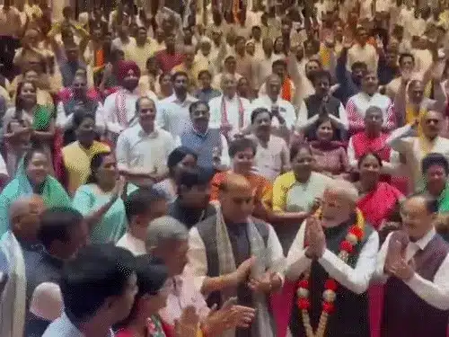 Modi garlanded by Rajnath : दिल्ली स्थित संसद भवन परिसर में मंगलवार सुबह 10 बजे से राष्ट्रीय जनतांत्रिक गठबंधन (NDA) के सांसदों की महत्वपूर्ण बैठक शुरू हुई। बैठक की शुरुआत एक खास पल के साथ हुई, जब हाल ही में सफल हुए ऑपरेशन सिंदूर को लेकर प्रधानमंत्री नरेंद्र मोदी को सम्मानित किया गया। रक्षा मंत्री राजनाथ सिंह ने पीएम मोदी को जयमाला पहनाकर उनका अभिनंदन किया। इस दौरान पूरे परिसर में ‘हर-हर महादेव’ के गगनभेदी नारे गूंज उठे।
