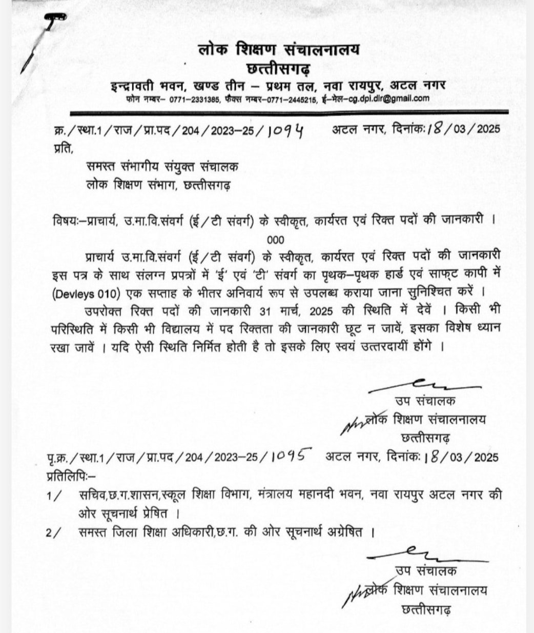 रायपुर @thetarget365 स्कूल शिक्षा विभाग में प्राचार्य पदोन्नति की प्रक्रिया तेज हो गई है। लोक शिक्षण संचालनालय (DPI) ने सभी संयुक्त संचालकों (JD) को पत्र जारी कर उच्चतर माध्यमिक विद्यालय संवर्ग ई एवं टी के स्वीकृत, कार्यरत और रिक्त पदों की जानकारी एक सप्ताह के भीतर उपलब्ध कराने के निर्देश दिए हैं।