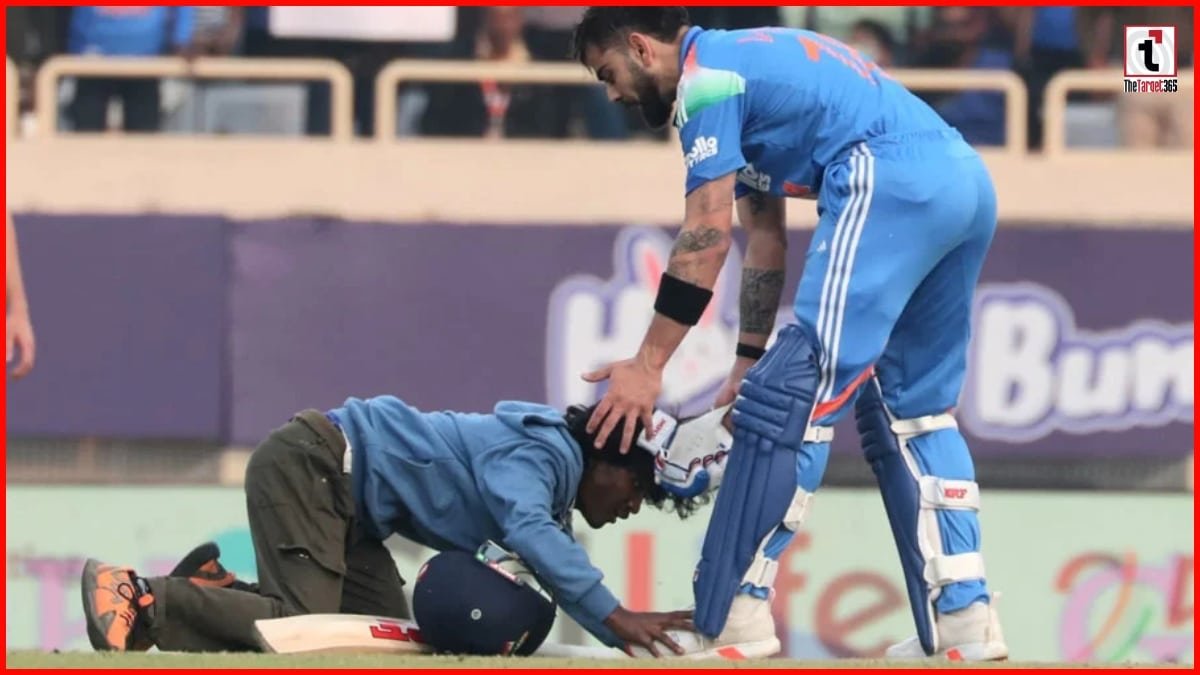 भारतीय पारी के 38वें ओवर में विराट कोहली ने 102 गेंदों का सामना करते हुए अपना शानदार शतक पूरा किया। जैसे ही कोहली अपना शतक सेलिब्रेट कर रहे थे, तभी एक विराट फैन सुरक्षा घेरे को चकमा देते हुए तेजी से मैदान में घुस आया। यह फैन सीधे विराट कोहली के पास पहुँचा और उनके सामने लेट गया (पैर छूने लगा), जो एक तरह से समर्पण व्यक्त करने का तरीका था।मैदान पर अप्रत्याशित रूप से इस तरह के व्यवहार से अफरा-तफरी मच गई। हालाँकि, सुरक्षा कर्मचारियों ने इस फैन के साथ ज्यादा उग्र व्यवहार नहीं किया और उसे तुरंत मैदान के बाहर भेज दिया।